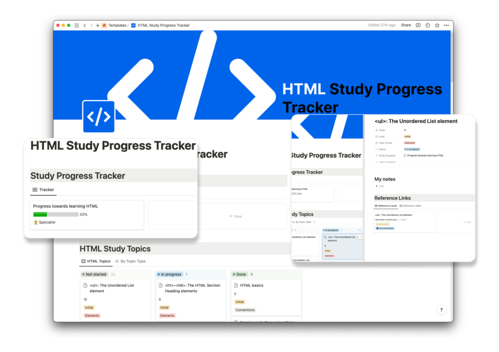 Elevate your HTML learning journey with this dynamic study progress tracker Notion template, designed to effortlessly monitor your study progress!